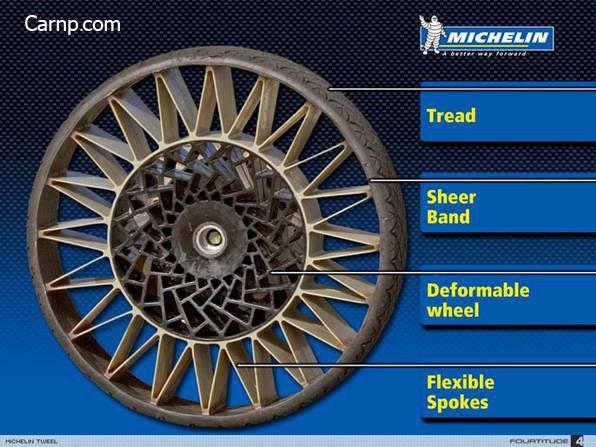 یکی دیگر از ویژگیهای خاص این تایرها وارد نشدن فشار کاملا یکسان به دیواره های جانبی و پایین و بالای تایرها در خودروی در حال حرکت است که معمولا در تایرهای خودروی با لاستیکهایی که با هوا پر شده اند اتفاق میفتد .این حالت منجر به وارد شدن فشار یکسان به دیواره های لاستیک و گرد ماندن آن می شود و در نهایت منجر به سفت وسخت شدن رانندگی و کاهش قابلیت انعطاف در مواقع ضروری بخصوص سر پیچها می گردد درحالیکه پره های بکار رفته در این لاستیک جدید این خاصیت را دارند تا در مواقع ضروری با انعطاف خود بر اثر شرایط خاص جاده باعث افزایش توان هندلینگ و قدرت فرمانپذیری خودرو گردند